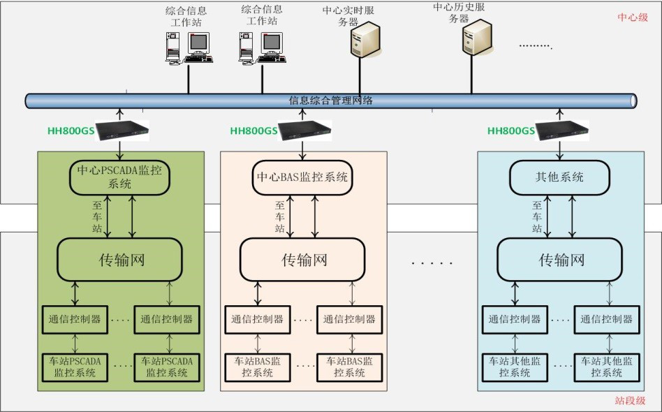 以軌道交通綜合監(jiān)控系統(tǒng)(ISCS)為例,進(jìn)行說明。軌道交通 ISCS 系統(tǒng)包括:中心 PSCADA 監(jiān)控系統(tǒng),中心 BAS 監(jiān)控系統(tǒng)等,在這些子系統(tǒng)之間,可以通過 HH800GS 進(jìn)行數(shù)據(jù)通訊保護(hù)。
